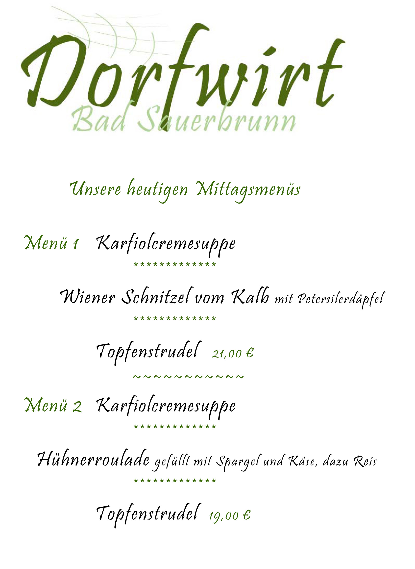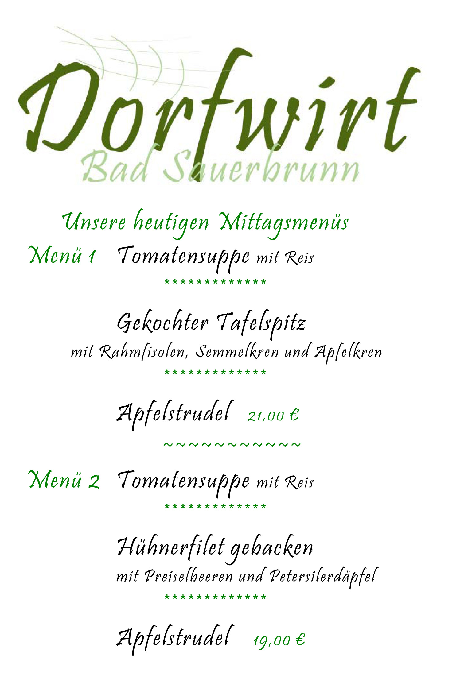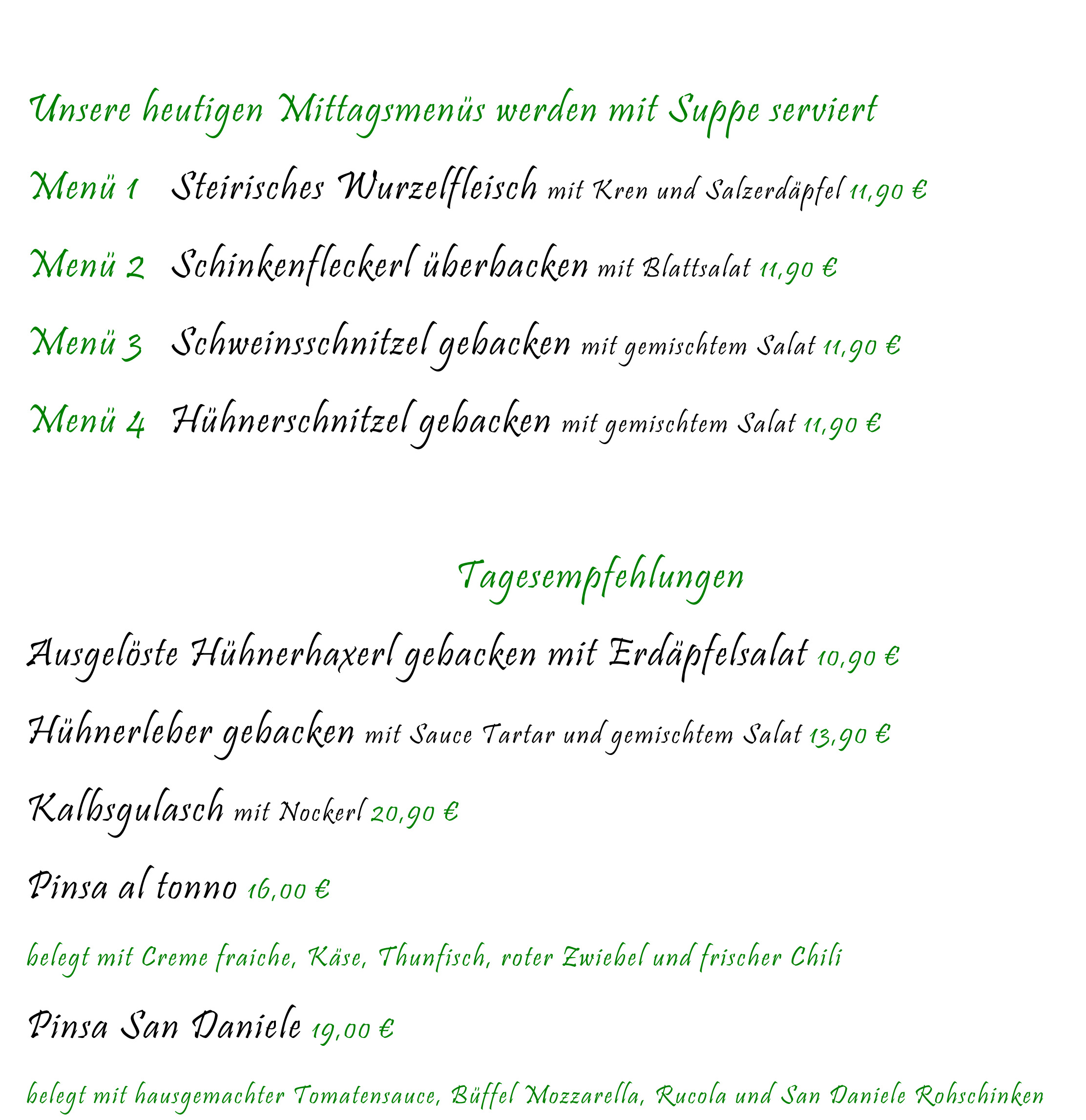 Tageskarte Preise inkl. MwSt. Alle Speisen auch zum Mitnehmen, wir freuen uns auf Ihre Bestellung! Für nicht eigens mitgebrachte Verpackung wird pro Speise 1 Euro verrechnet!